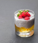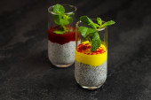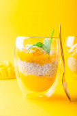 Budyń chia z puree mango w przezroczystym szkle izolowanym na czarnym tle.