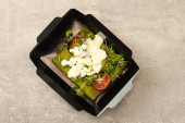 Zdrowa miska z kotletami wołowymi, kalafiorem, zieloną fasolą i pomidorami w eko papierowym pojemniku izolowanym na czarnym tle. Zdrowa dostawa żywności i codzienna koncepcja racji. Zbliżenie.