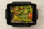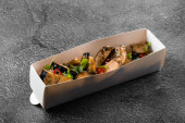 Zdjęcie "Zdrowa miska z kotletami wołowymi, kalafiorem, zieloną fasolą i pomidorami w eko papierowym pojemniku izolowanym na czarnym tle. Zdrowa dostawa żywności i codzienna koncepcja racji. Zbliżenie." może być wykorzystywane do celów osobistych i komercyjnych zgodnie z warunkami zakupionej licencji Royalty-free. Obraz jest dostępny do pobrania w jakości wysokiej rozdzielczości do 5760x3840.