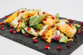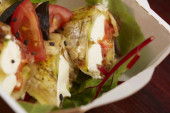 Kawałek quiche z kurczakiem, pomidorami wiśniowymi i serem. Apetyczny otwarty placek francuski w eko papierowym pojemniku odizolowanym na czarnym tle. Zdrowa żywność i codzienna koncepcja żywnościowa.
