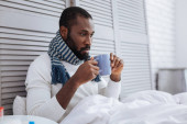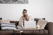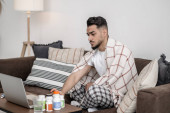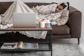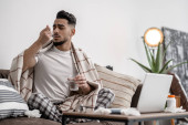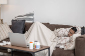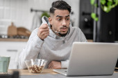 Chory człowiek siedzi przy laptopie i rozmawia z lekarzem online.
