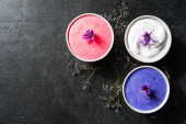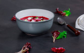 Kalafior zupa ziemniaczana puree w okrągłej misce na szarym tle, widok z góry. Wegetariańska koncepcja zdrowej żywności
