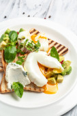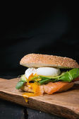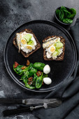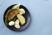 Sałatka Cezara z mięsem kurczaka w papierze zabrać pojemnik z sosem anchois izolowane na czarnym tle. Koncepcja zdrowej żywności, dostawa dań z restauracji. Widok góry. Wolne miejsce na tekst.
