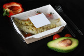 Zdjęcie "Sałatka Cezara z mięsem kurczaka w papierze zabrać pojemnik z sosem anchois izolowane na czarnym tle. Koncepcja zdrowej żywności, dostawa dań z restauracji. Widok góry. Wolne miejsce na tekst." może być wykorzystywane do celów osobistych i komercyjnych zgodnie z warunkami zakupionej licencji Royalty-free. Obraz jest dostępny do pobrania w jakości wysokiej rozdzielczości do 5760x3840.