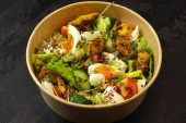 Sałatka zabiera. Zdrowa sałatka z różnymi sałatą, kukurydzą, kalafiorami i kurczakiem w czarnym pudełku z papieru nadającego się do recyklingu na szarym tle. Odbiór. Zdrowa koncepcja dostarczania żywności w restauracji.