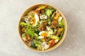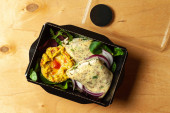 Sałatka zabiera. Zdrowa sałatka z różnymi sałatą, kukurydzą, kalafiorami i kurczakiem w czarnym pudełku z papieru nadającego się do recyklingu na szarym tle. Odbiór. Zdrowa koncepcja dostarczania żywności w restauracji.