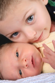 Zdjęcie "Dwa tygodnie noworodka w rękawiczkach przeciw chwytaniu spotyka się ze starszym o cztery lata bratem" może być wykorzystywane do celów osobistych i komercyjnych zgodnie z warunkami zakupionej licencji Royalty-free. Obraz jest dostępny do pobrania w jakości wysokiej rozdzielczości do 5760x3840.