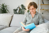 Staruszka siedzi na kanapie i cieszy się ciekawą powieścią fotograficzną.