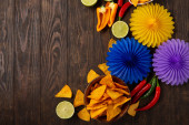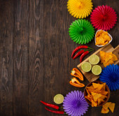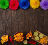Meksykańska fiesta tła z tradycyjnymi meksykańskimi nachos chipsy, papryka chili, kaktusy i sombrero kapelusz na niebieskim tle. Koncepcja świętowania Cinco de Mayo (5 maja). Widok z góry, przestrzeń kopiowania.