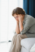 Pensive miło w średnim wieku Pani patrząc z dala siedzieć samotnie w domu czuć się niespokojny samotny, smutne depresji melancholijnej starej dojrzałej kobiety cierpią z smutku smutek myślenia problem cierpi z samotności