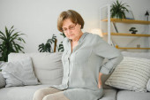Starsza kobieta siedzi na kanapie i bierze tabletki w domu. Emeryt z lekami.