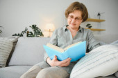 Zdjęcie "Spokojny czytania. Portret zadumany w wieku kobieta czytania ulubionej literatury w przytulnym domu. Leży ona na poduszki na wygodną sofę. Nogi pokryte są w miękki koc" może być wykorzystywane do celów osobistych i komercyjnych zgodnie z warunkami zakupionej licencji Royalty-free. Obraz jest dostępny do pobrania w jakości wysokiej rozdzielczości do 5760x3840.