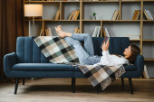 Zdjęcie "Spokojny czytania. Portret zadumany w wieku kobieta czytania ulubionej literatury w przytulnym domu. Leży ona na poduszki na wygodną sofę. Nogi pokryte są w miękki koc" może być wykorzystywane do celów osobistych i komercyjnych zgodnie z warunkami zakupionej licencji Royalty-free. Obraz jest dostępny do pobrania w jakości wysokiej rozdzielczości do 5760x3840.