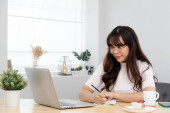 Zdjęcie "Azjatka myśli o czymś podczas korzystania z laptopa w domu." może być wykorzystywane do celów osobistych i komercyjnych zgodnie z warunkami zakupionej licencji Royalty-free. Obraz jest dostępny do pobrania w jakości wysokiej rozdzielczości do 5760x3840.
