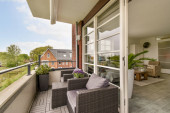 Przestronny przeszklony balkon z wygodnymi fotelami