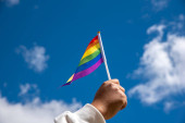 Zdjęcie "LGTB lub tęczowa flaga. Gej duma flaga na różowym i niebieskim tle.. Miejsce" może być wykorzystywane do celów osobistych i komercyjnych zgodnie z warunkami zakupionej licencji Royalty-free. Obraz jest dostępny do pobrania w jakości wysokiej rozdzielczości do 5760x3840.