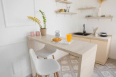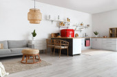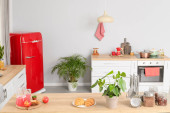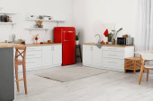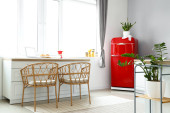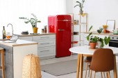 Zdjęcie "Wnętrze jasnej kuchni z czerwoną lodówką, lady i stół jadalny" może być wykorzystywane do celów osobistych i komercyjnych zgodnie z warunkami zakupionej licencji Royalty-free. Obraz jest dostępny do pobrania w jakości wysokiej rozdzielczości do 5760x3840.