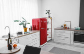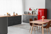 Wnętrze jasnej kuchni z czerwoną lodówką, lady i stół jadalny
