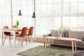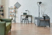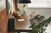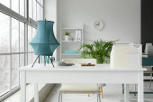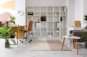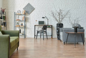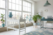Wnętrze stylowego biura z wygodnymi miejscami pracy i dużym oknem