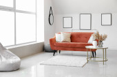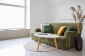 Wazon z kwiatami mimozy na stole i kanapa we wnętrzu salonu