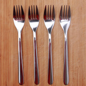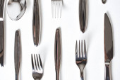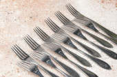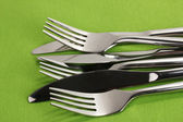 Wiele różnych widelców na zielonym tle, widok z góry