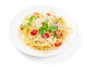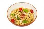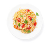 Włoski makaron z pomidorami, ser parmezan i bazylia izolowane na białym tle. Widok z góry.