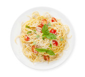 Zdjęcie "Włoski makaron z pomidorami, ser parmezan i bazylia izolowane na białym tle. Widok z góry." może być wykorzystywane do celów osobistych i komercyjnych zgodnie z warunkami zakupionej licencji Royalty-free. Obraz jest dostępny do pobrania w jakości wysokiej rozdzielczości do 5760x3840.