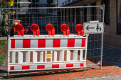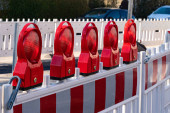 Zdjęcie "Budowa plastikowej białej bariery na drodze z czerwonymi światłami odblaskowymi jako instalacja zabezpieczająca." może być wykorzystywane do celów osobistych i komercyjnych zgodnie z warunkami zakupionej licencji Royalty-free. Obraz jest dostępny do pobrania w jakości wysokiej rozdzielczości do 5760x3840.