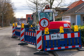 Budowa plastikowej białej bariery na drodze z czerwonymi światłami odblaskowymi jako instalacja zabezpieczająca.