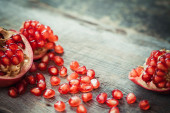 Zdjęcie "Kawałek dojrzałe granatu i czerwony ziarna na drewnianym stole" może być wykorzystywane do celów osobistych i komercyjnych zgodnie z warunkami zakupionej licencji Royalty-free. Obraz jest dostępny do pobrania w jakości wysokiej rozdzielczości do 5760x3840.