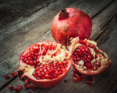 Kawałek dojrzałe granatu i czerwony ziarna na drewnianym stole