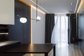 Wystrój wnętrz przestronnego studia kuchennego. Modne meble w salonie i nowoczesne szczegóły w kuchni.