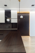 Zdjęcie "Wystrój wnętrz przestronnego studia kuchennego. Modne meble w salonie i nowoczesne szczegóły w kuchni." może być wykorzystywane do celów osobistych i komercyjnych zgodnie z warunkami zakupionej licencji Royalty-free. Obraz jest dostępny do pobrania w jakości wysokiej rozdzielczości do 5760x3840.