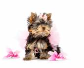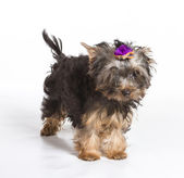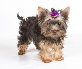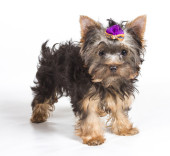 dziewczyna szczenięta Yorkshire terrier siedzący na białym tle