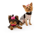dwa szczeniaki yorkshire terrier ubrane w garnitury