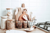 Zdjęcie "Zamknij widok ceramicznych filiżanek z bambusową szczotką do mycia naczyń, drewnianą łyżką i łopatką do gotowania na blat. Przybory kuchenne, obrusy i deski do krojenia na półce, na ścianach z płytkami, z przestrzenią do kopiowania" może być wykorzystywane do celów osobistych i komercyjnych zgodnie z warunkami zakupionej licencji Royalty-free. Obraz jest dostępny do pobrania w jakości wysokiej rozdzielczości do 5760x3840.