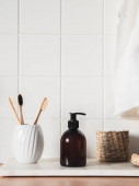 Zamknij widok ceramicznych filiżanek z bambusową szczotką do mycia naczyń, drewnianą łyżką i łopatką do gotowania na blat. Przybory kuchenne, obrusy i deski do krojenia na półce, na ścianach z płytkami, z przestrzenią do kopiowania