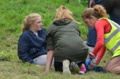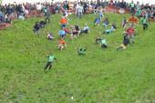 Zawodnicy biorą udział w tradycyjnych wyścigach serów toczących się na Cooper 's Hill 25 maja 2015 roku w Brockworth w Wielkiej Brytanii. Tysiące osób uczestniczyło w nieusankcjonowanym corocznym wydarzeniu z XIX wieku..