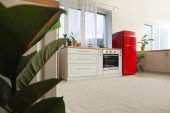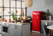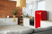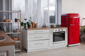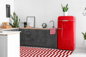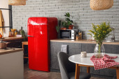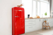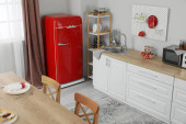 Wnętrze jasnej kuchni z retro lodówka, białe lady i stół jadalny