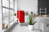Zdjęcie "Wnętrze jasnej kuchni z retro lodówka, białe lady i stół jadalny" może być wykorzystywane do celów osobistych i komercyjnych zgodnie z warunkami zakupionej licencji Royalty-free. Obraz jest dostępny do pobrania w jakości wysokiej rozdzielczości do 5760x3840.