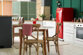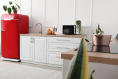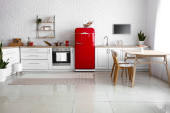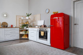 Wnętrze jasnej kuchni z czerwoną lodówką, lady i półki