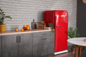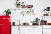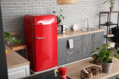 Wnętrze nowoczesnej kuchni z czerwoną lodówką, lady i pegboard