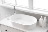 Zdjęcie "Nowoczesny umywalka i różne materiały do kąpieli na stole" może być wykorzystywane do celów osobistych i komercyjnych zgodnie z warunkami zakupionej licencji Royalty-free. Obraz jest dostępny do pobrania w jakości wysokiej rozdzielczości do 5760x3840.