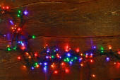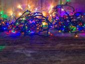 Kolorowe światła Bożego Narodzenia na drewnianym tle rustykalnym. filtrowanego obrazu