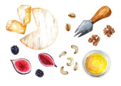Miska z marynowanym plasterkami ogórka z cebulą i przyprawami. Ilustracja akwareli. Domowej roboty warzywa w puszkach. Widok z góry