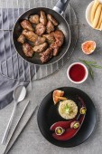 Schab z grilla z cebulą i pieczarkami, podawany z tłuczonymi ziemniakami.