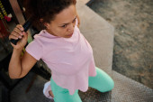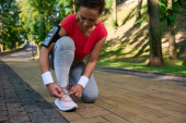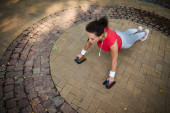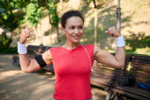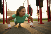 Zdjęcie "Zdeterminowana Latynoska atletka robi pompki z drewnianej ławki w parku miejskim, pompując mięśnie ramion, bicepsy i tricepsy podczas treningu funkcjonalnego w godzinach porannych w letni dzień" może być wykorzystywane do celów osobistych i komercyjnych zgodnie z warunkami zakupionej licencji Royalty-free. Obraz jest dostępny do pobrania w jakości wysokiej rozdzielczości do 5760x3840.