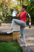 Zdeterminowana Latynoska atletka robi pompki z drewnianej ławki w parku miejskim, pompując mięśnie ramion, bicepsy i tricepsy podczas treningu funkcjonalnego w godzinach porannych w letni dzień