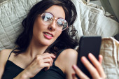 młoda kobieta korzystająca z telefonu komórkowego podczas leżenia w łóżku