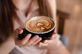 Zbliżenie obraz pięknej azjatyckiej kobiety trzymającej filiżankę gorącej kawy